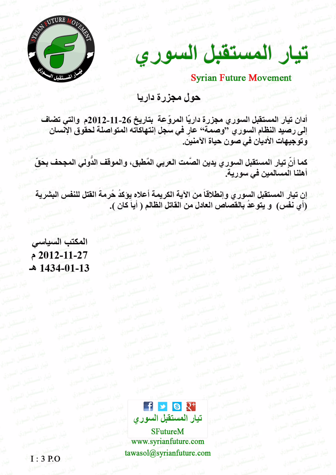 أدان تيار المستقبل السوري مجزرة داريّا المروِّعة بتاريخ 26-11-2012م والتي تضاف إلى رصيد النظام السوري “وصمةَ” عارٍ في سجلِ إنتهاكاته المتواصلة لحقوق الإنسان وتوجيهات الأديان في صون حياة الآمنين.كما أنّ تيار المستقبل السوري يدين الصَّمت العربي المٌطبق، والموقف الدُّولي المجحف بحَقِّ أهلنا الُمسالمين في سورية.
