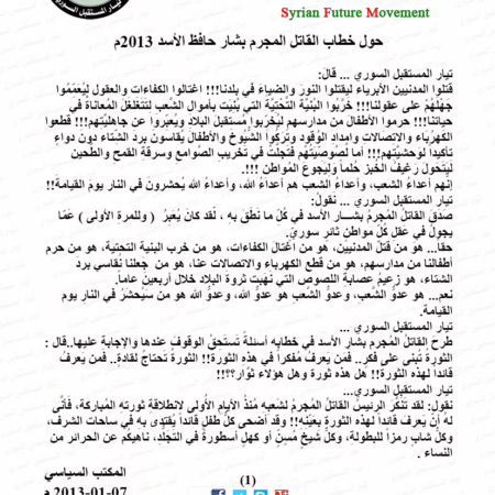تيار المستقبل السوري …يَستَنكِرُ وبشدّةَ عبارات الشتم التي أطلقها المَدعُوُّ ( رئيساً ) على شَعبهِ حين قال عنهم : (
