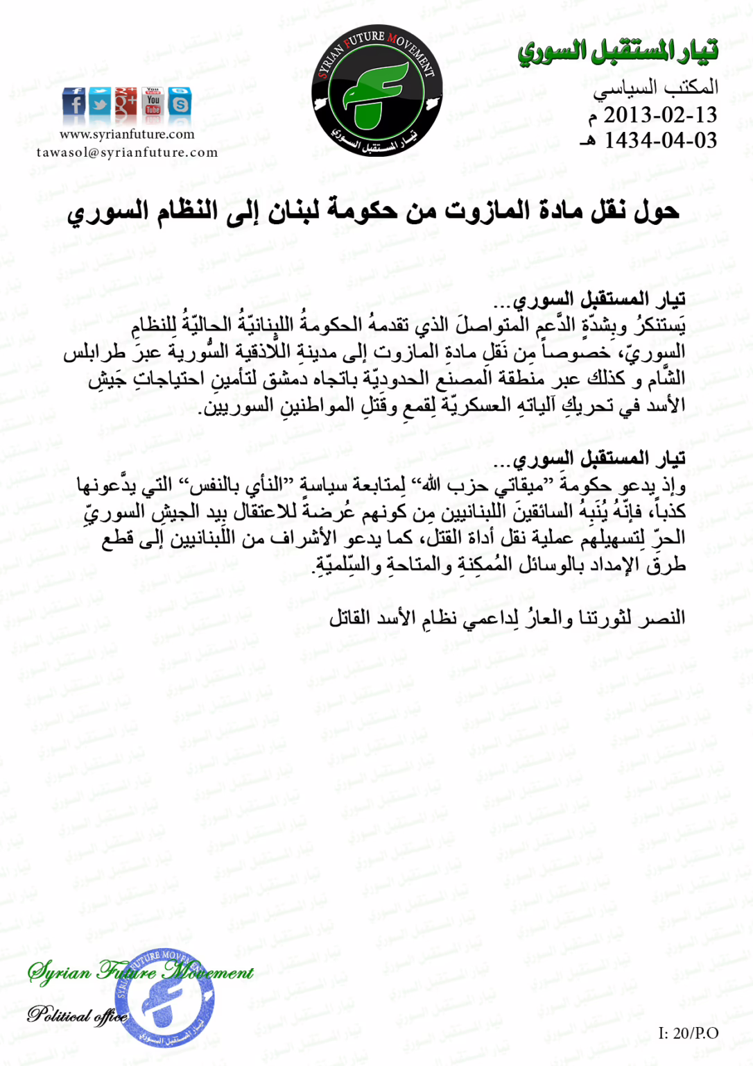 يَستنكرُ وبِشدّةٍ الدَّعم المتواصلَ الذي تقدمهُ الحكومةُ اللبنانيّةُ الحاليّةُ لِلنظامِ السوريّ، خصوصاً مِن نَقلِ مادةِ المازوت إلى مدينةِ اللَّاذقية السُّورية عبرَ طرابلس الشَّام و كذلك عبر منطقة المصنع الحدوديّة باتجاه دمشق لتأمينِ احتياجاتِ جَيشِ الأسد في تحريكِ آلياتهِ العسكريّة لِقمعِ وقَتلِ المواطنينِ السوريين.
