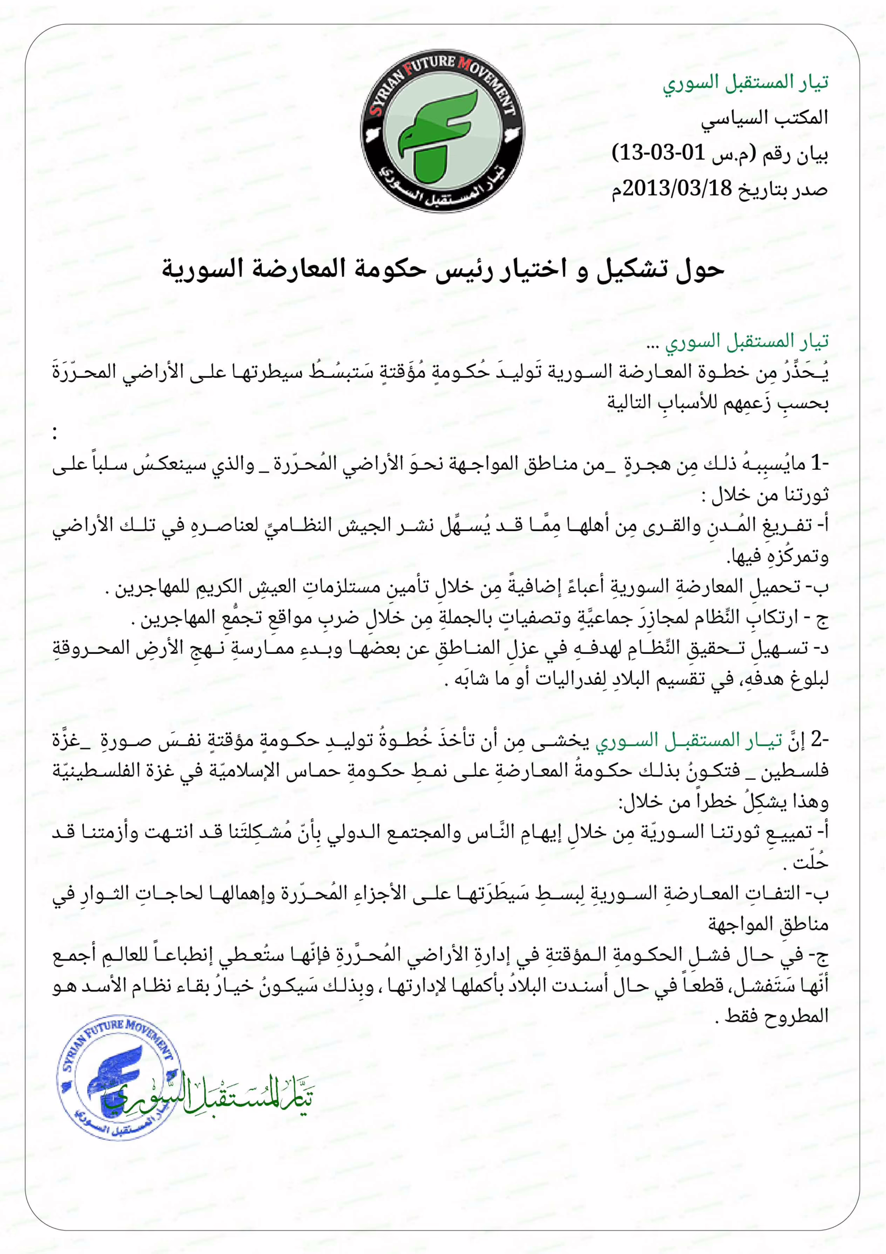 -2 إنَّ تيار المستقبل السوري يخشى مِن أن تأخذَ خُطوةُ توليدِ حكومةٍ مؤقتةٍ نفسَ صورةِ غزَّة فلسطين فتكونُ بذلك حكومةُ المعارضةِ على نمطِ حكومةِ حماس الإسلاميّة في غزة الفلسطينيّة وهذا يشكِلُ خطراً من خلال: