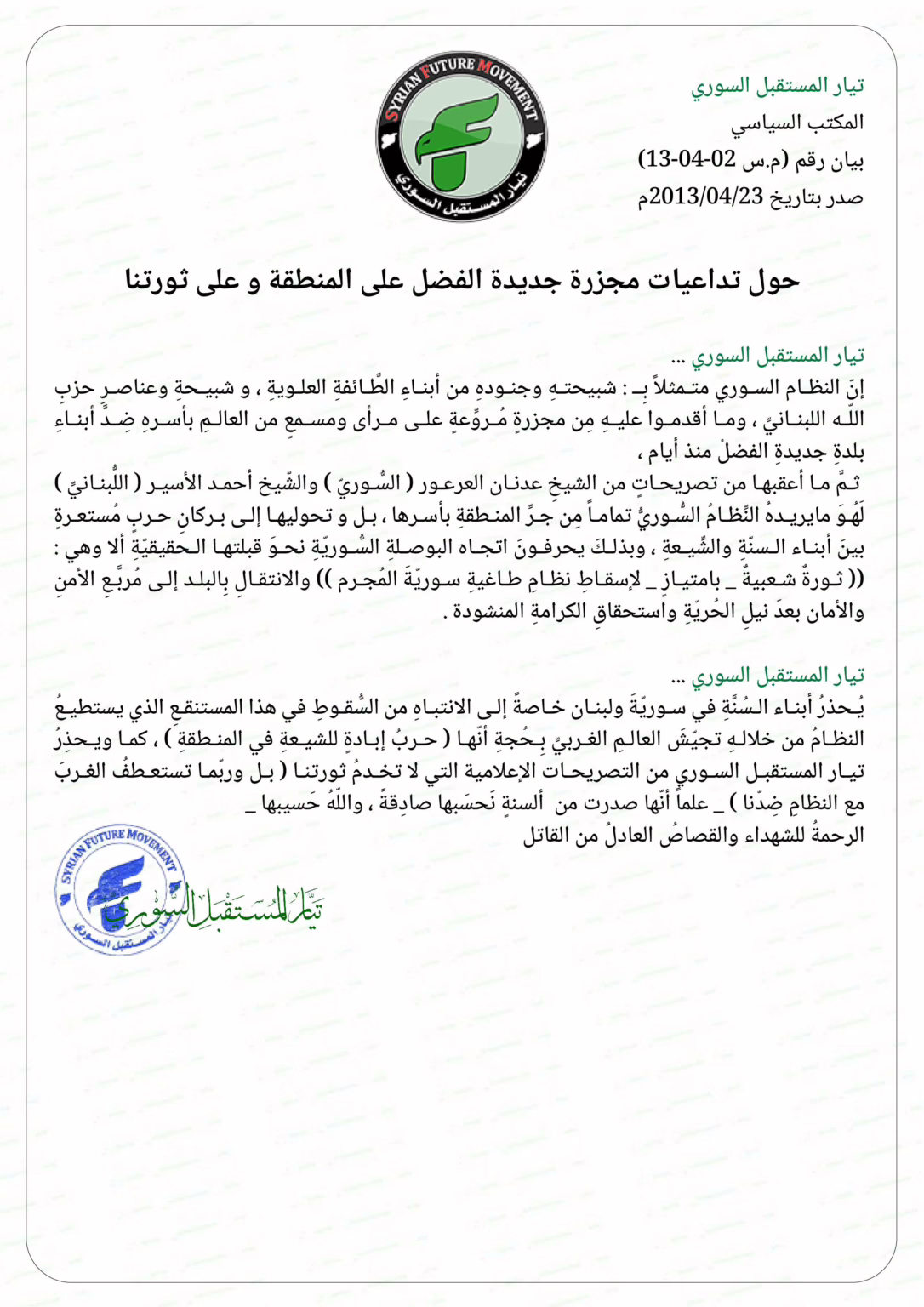 يُحذرُ أبناء السُنَّةِ في سوريّةَ ولبنان خاصةً إلى الانتباهِ من السُّقوطِ في هذا المستنقعِ الذي يستطيعُ النظامُ من خلالهِ تجيّشَ العالمِ الغربيِّ بِحُجةِ أنّها ( حربُ إبادةٍ للشيعةِ في المنطقةِ ) ، كما ويحذِرُ تيار المستقبل السوري من التصريحات الإعلامية التي لا تخدمُ ثورتنا ( بل وربّما تستعطفُ الغربَ مع النظامِ ضِدّنا ) _ علماً أنّها صدرت من ألسنةٍ نَحسَبها صادِقةً ، واللّهُ حَسيبها _