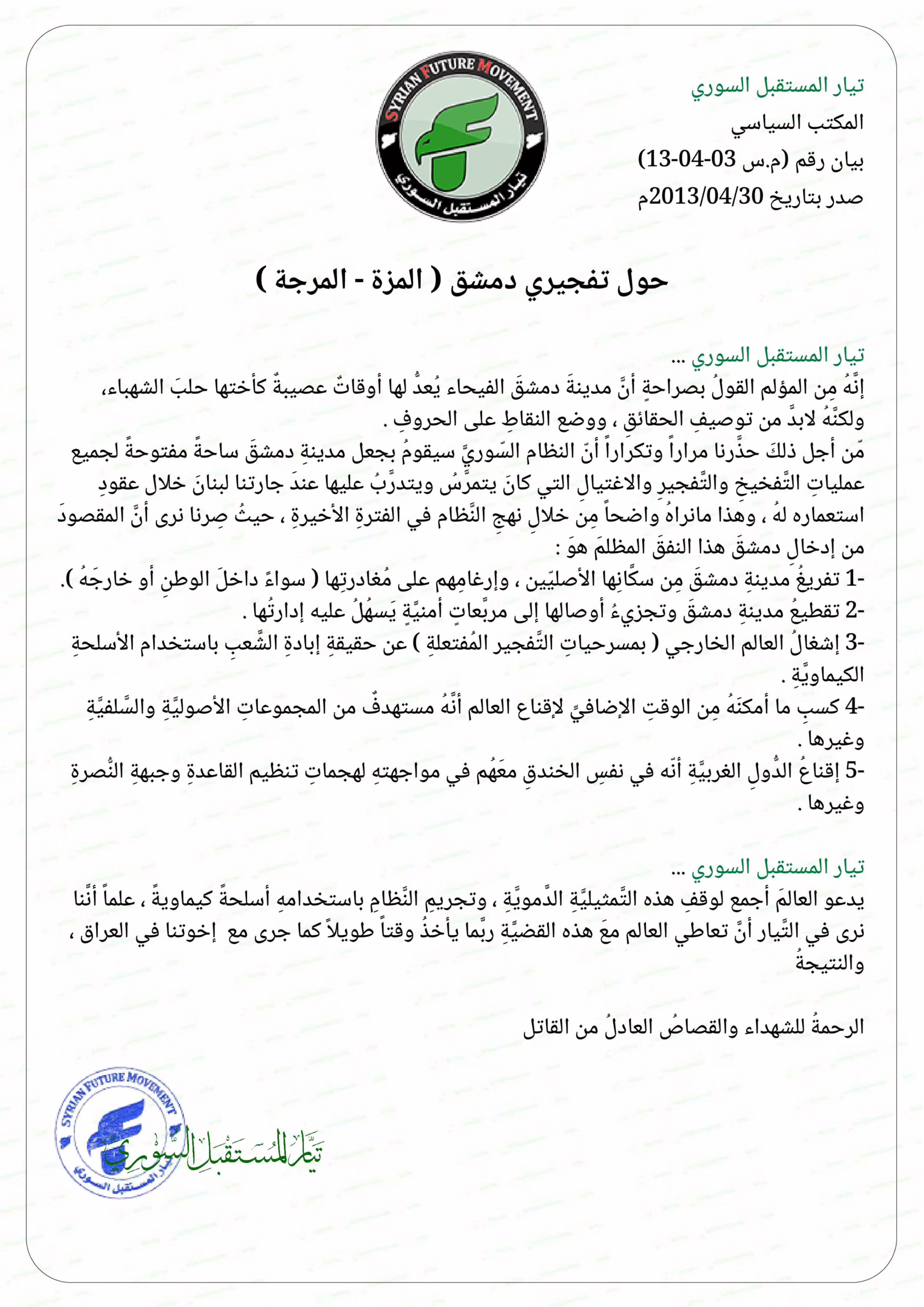 يدعو العالمَ أجمع لوقفِ هذه التَّمثيليَّةِ الدَّمويَّةِ ، وتجريمِ النَّظامِ باستخدامهِ أسلحةً كيماويةً ، علماً أنَّنا نرى في التَّيار أنَّ تعاطي العالم معَ هذه القضيَّةِ ربَّما يأخذُ وقتاً طويلاً كما جرى مع إخوتنا في العراق ، والنتيجةُ