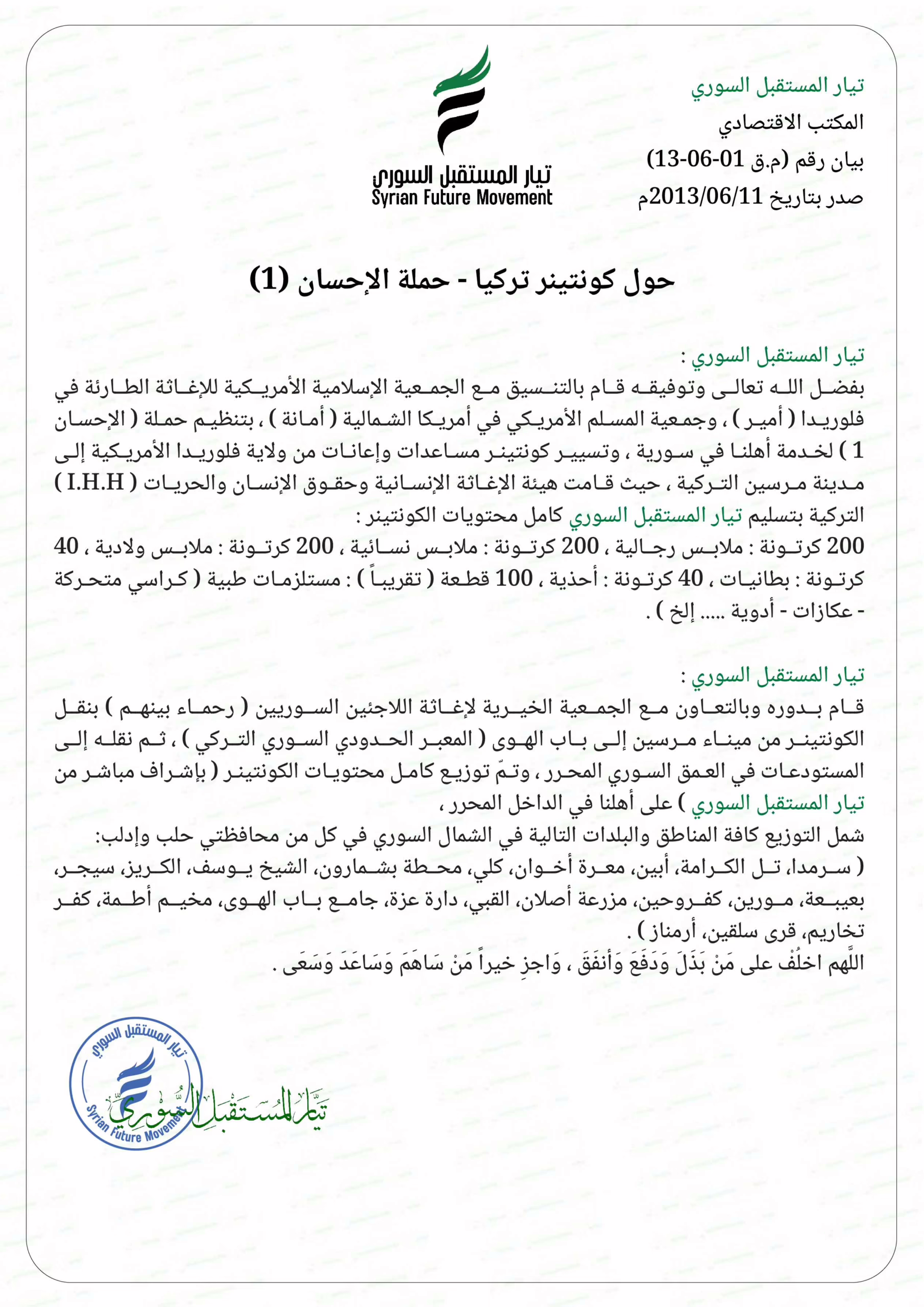 بفضل الله تعالى وتوفيقه قام بالتنسيق مع الجمعية الإسلامية الأمريكية للإغاثة الطارئة في فلوريدا ( أمير ) ، وجمعية المسلم الأمريكي في أمريكا الشمالية ( أمانة ) ، بتنظيم حملة ( الإحسان 1 ) لخدمة أهلنا في سورية ، وتسيير كونتينر مساعدات وإعانات من ولاية فلوريدا الأمريكية إلى مدينة مرسين التركية ، حيث قامت هيئة الإغاثة الإنسانية وحقوق الإنسان والحريات ( I.H.H ) التركية بتسليم تيار المستقبل السوري كامل محتويات الكونتينر :