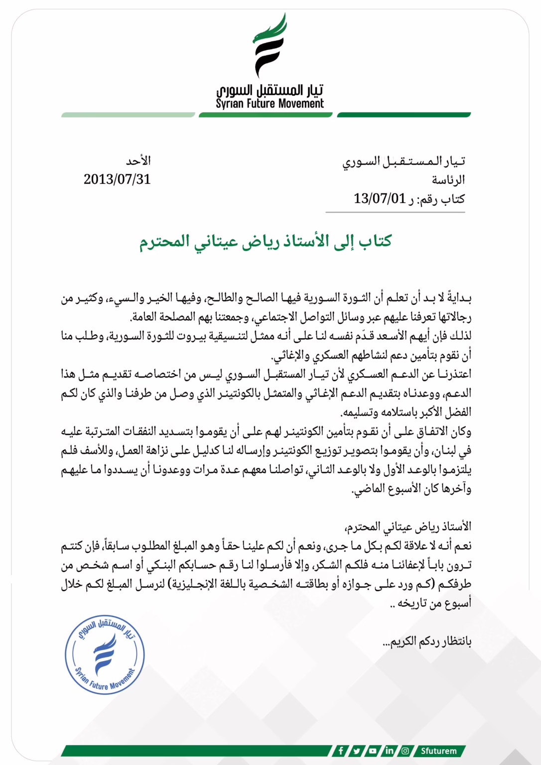 اعتذرنا عن الدعم العسكري لأن تيار المستقبل السوري ليس من اختصاصه تقديم مثل هذا الدعم، ووعدناه بتقديم الدعم الإغاثي والمتمثل بالكونتينر الذي وصل من طرفنا والذي كان لكم الفضل الأكبر باستلامه وتسليمه.