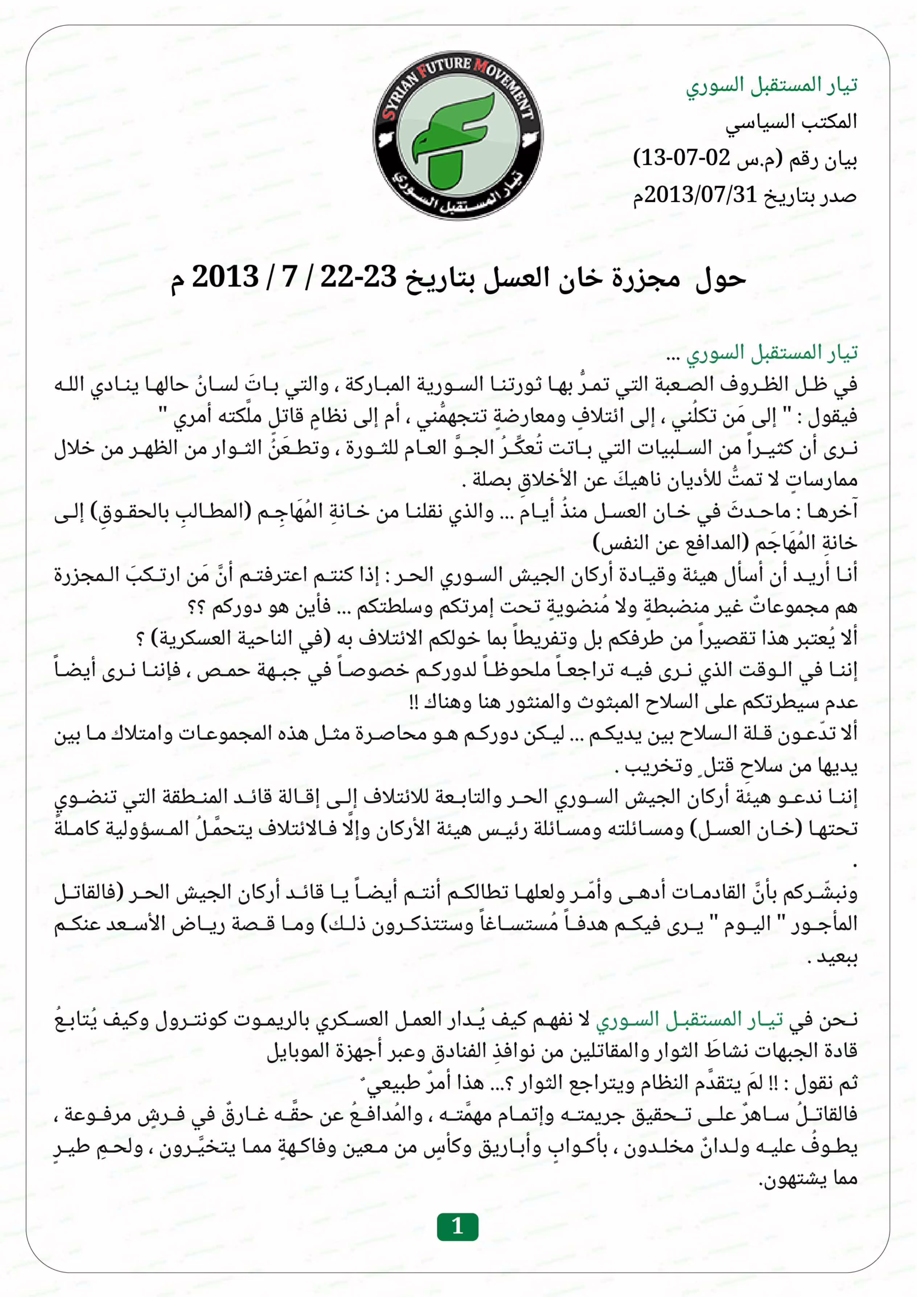 إننا ندعو هيئة أركان الجيش السوري الحر والتابعة للائتلاف إلى إقالة قائد المنطقة التي تنضوي تحتها (خان العسل) ومسائلته ومسائلة رئيس هيئة الأركان وإلَّا فالائتلاف يتحمَّلُ المسؤولية كاملةً .