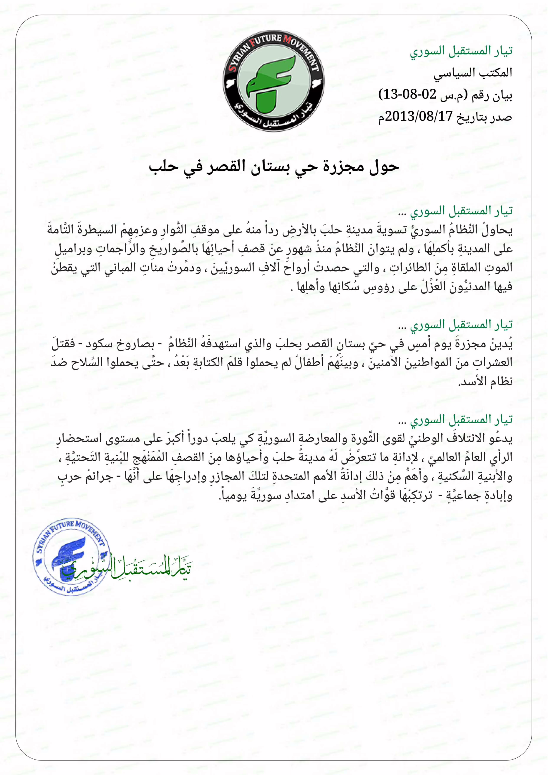 يُدينُ مجزرةَ يوم أمسٍ في حيِّ بستانِ القصر بحلبَ والذي استهدفَهُ النِّظامُ – بصاروخ سكود – فقتلَ العشراتِ منَ المواطنينَ الآمنينَ ، وبينَهُمْ أطفالٌ لم يحملوا قلمَ الكتابةِ بَعْدُ ، حتَّى يحملوا السِّلاح ضدَ نظام الأسد.