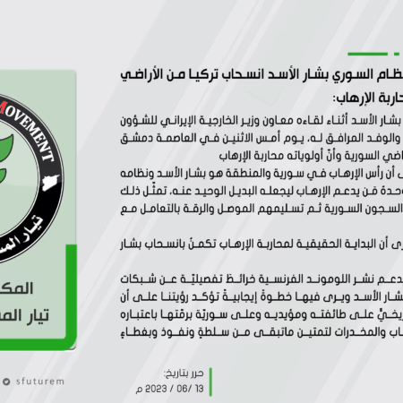 تيار المستقبل السوري: يوصي بإضافة تمثيل كلٍّ من الجانبين الأمريكيّ والعربيّ على طاولة المفاوضات للتّفاهم حول تفاصيل تطبيق قانون جنيف