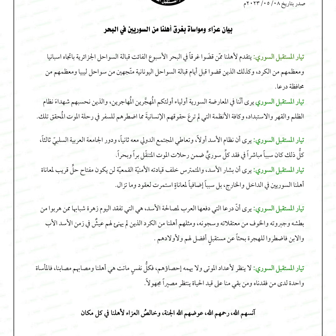 تيار المستقبل السوري: يتقدم لأهلنا ممّن قضَوا غرقاً في البحر الأسبوع الفائت قبالة السواحل الجزائرية باتجاه اسبانيا ومعظمهم من الكرد،