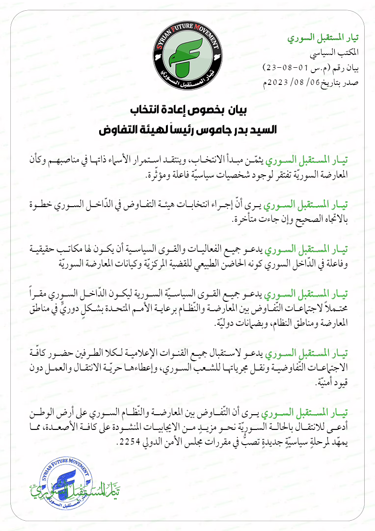 تيار المستقبل السوري يدعو جميع الفعاليات والقوى السياسية أن يكون لها مكاتب حقيقية وفاعلة في الدّاخل السوري كونه الحاضن الطبيعي للقضية المركزيّة وكيانات المعارضة السوريّة