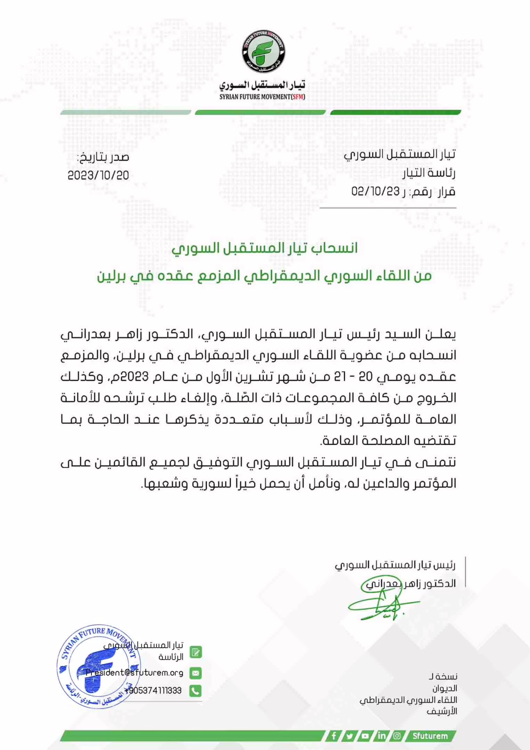 يعلن السيد رئيس تيار المستقبل السوري، الدكتور زاهر بعدراني انسحابه من عضوية اللقاء السوري الديمقراطي في برلين، والمزمع عقده يومي 20 – 21 من شهر تشرين الأول من عام 2023م، وكذلك الخروج من كافة المجموعات ذات الصّلة، وإلغاء طلب ترشحه للأمانة العامة للمؤتمر، وذلك لأسباب متعددة يذكرها عند الحاجة بما تقتضيه المصلحة العامة.