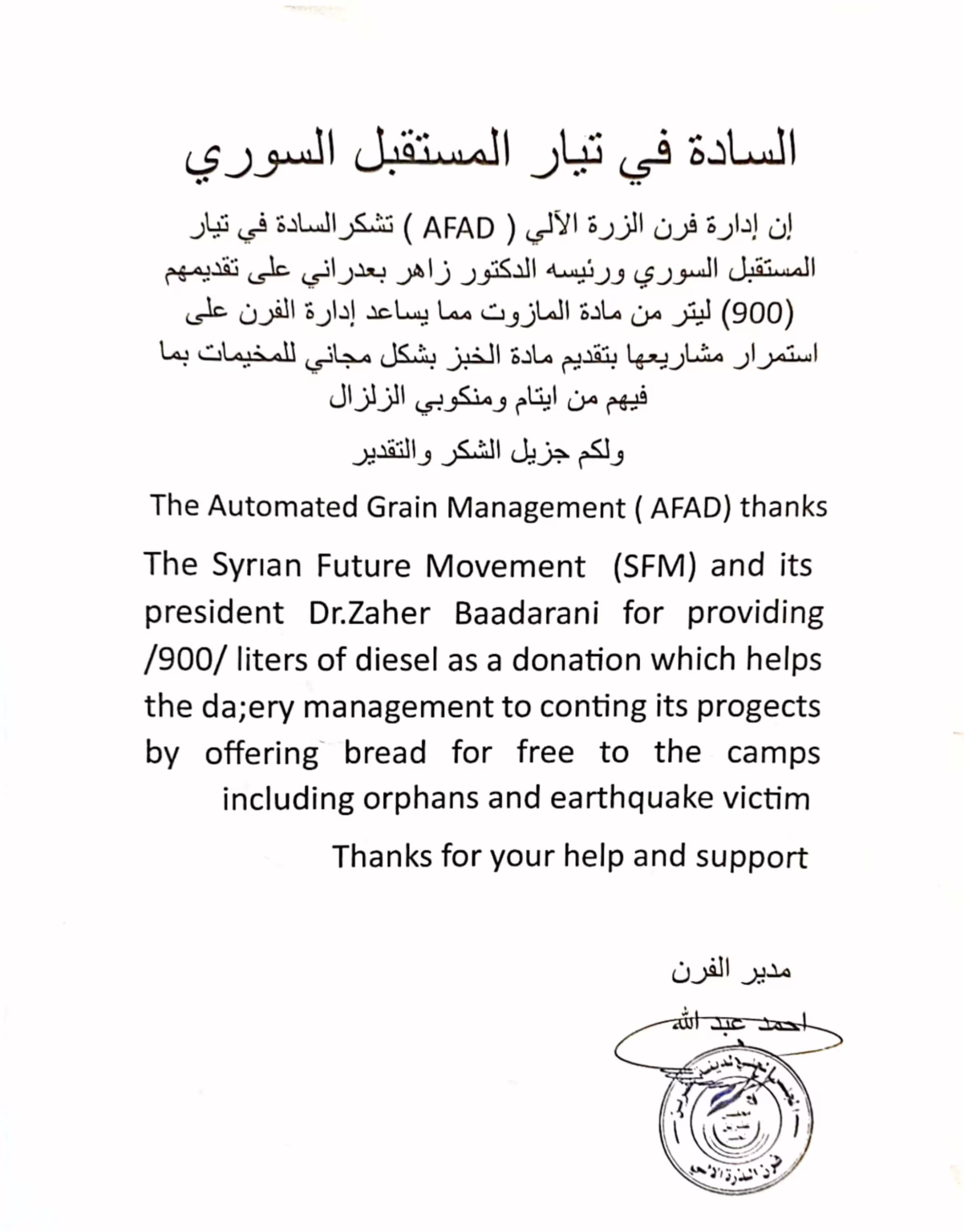 رسالة شكر من (AFAD) لتيار المستقبل السوري (SFM) على تقدمة الوقود لهم من أجل المساعدة في استمرار مشروعها بتقديم مادة الخبز بشكل مجاني للمخيمات بما فيهم من أيتام ومنكوبي الزلزال.