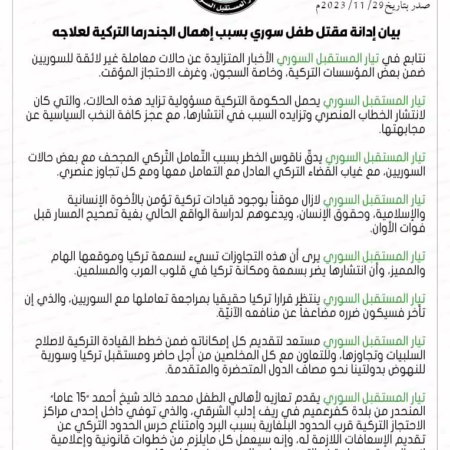 بيان إدانة مقتل طفل سوري بسبب إهمال الجندرما التركية لعلاجه