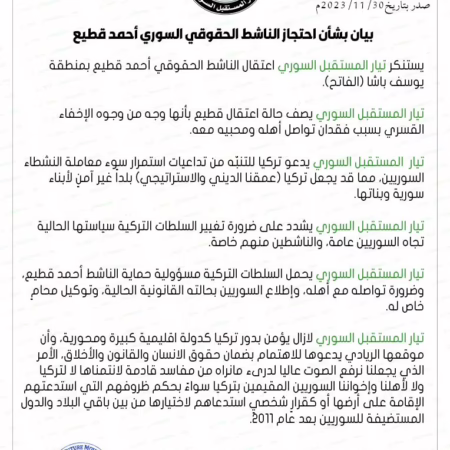تيار المستقبل السوري يحمل السلطات التركية مسؤولية حماية الناشط أحمد قطيع، وضرورة تواصله مع أهله،
