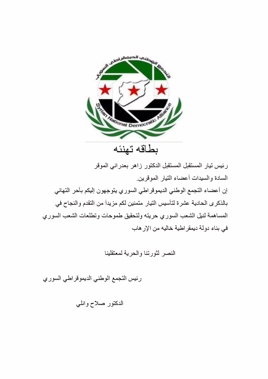 إن أعضاء التجمع الوطني الديموقراطي السوري يتوجهون إليكم بأحر التهاني بالذكرى الحادية عشرة لتأسيس التيار متمنين لكم مزيداً من التقدم والنجاح في المساهمة لنيل الشعب السوري حريته ولتحقيق طموحات وتطلعات الشعب السوري في بناء دولة ديمقراطية خاليه من الإرهاب