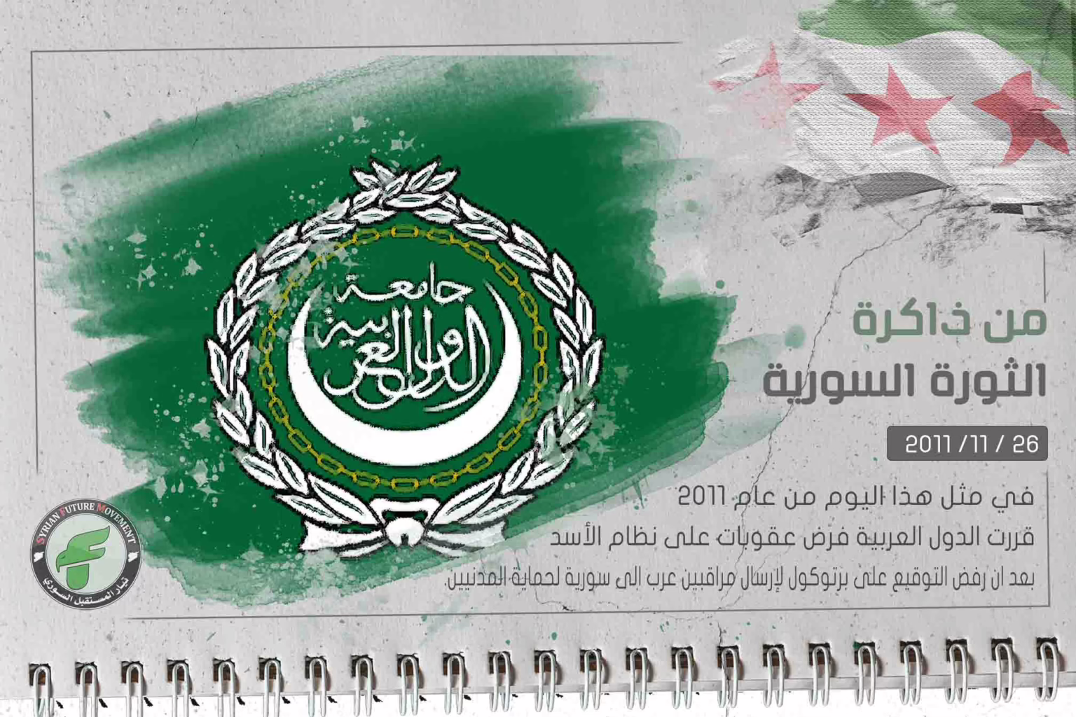 في مثل هذا اليوم من عام 2011، قررت الدول العربية فرض عقوبات على نظام الأسد بعد ان رفض التوقيع على برتوكول لإرسال مراقبين عرب الى سورية لحماية المدنيين.