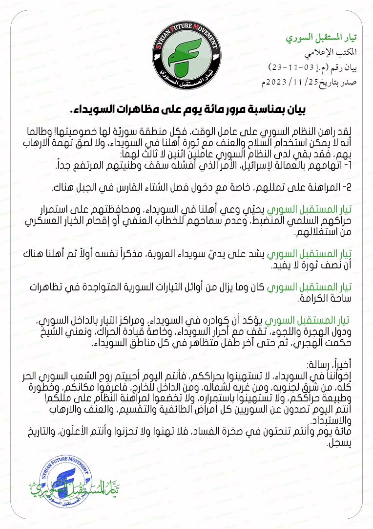 تيار المستقبل السوري يؤكد أن كوادره في السويداء، ومراكز التيار بالداخل السوري، ودول الهجرة واللجوء، تقف مع أحرار السويداء، وخاصةً قيادة الحراك، ونعني الشيخ حكمت الهجري، ثم حتى آخر طفل متظاهر في كل مناطق السويداء.