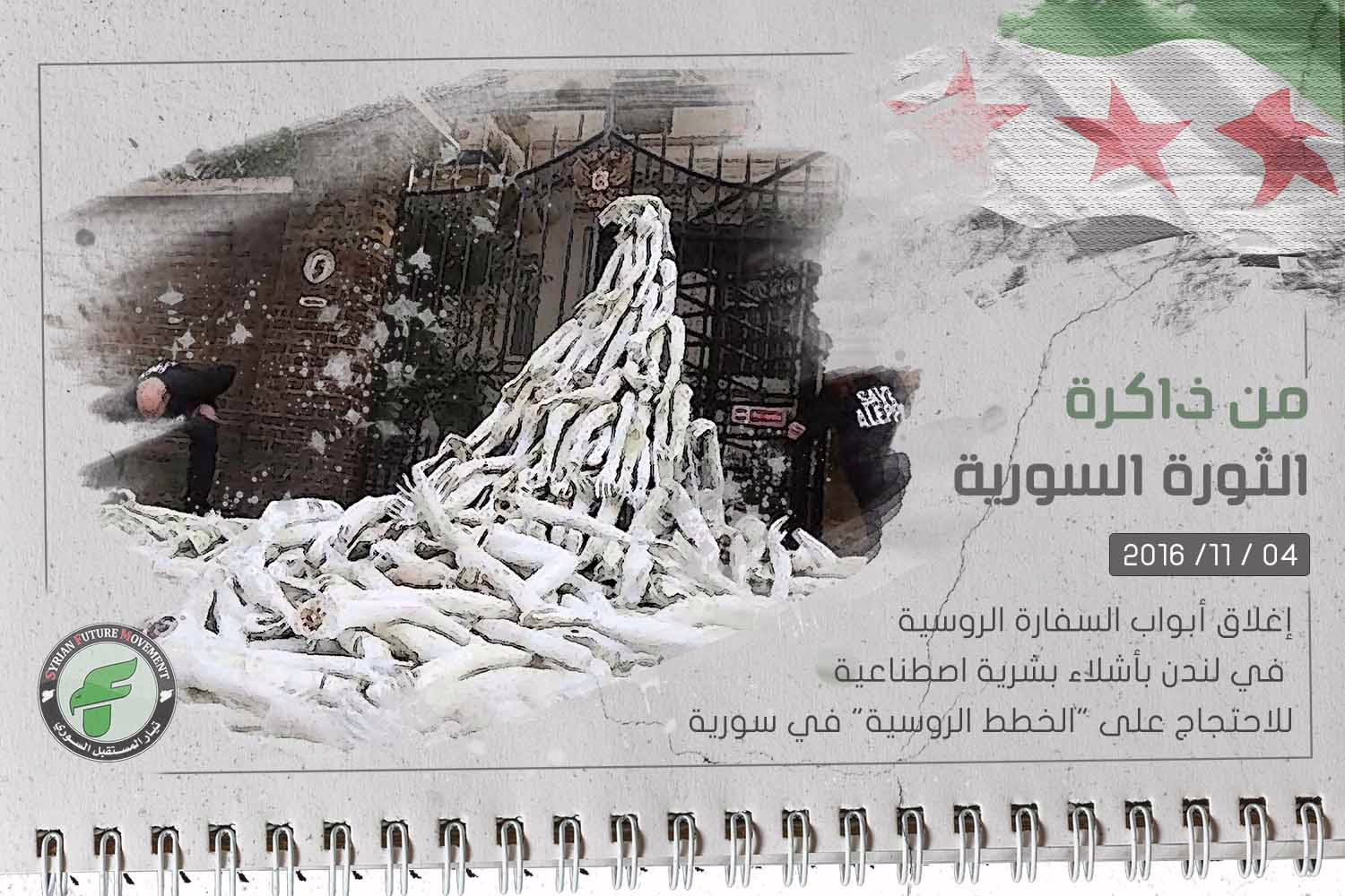 إغلاق لأبواب السفارة الروسية في لندن بـِ أشلاءَ بشريّةٍ اصطناعيّة احتجاجاً على "التدخل الروسي العسكري" في سورية.
