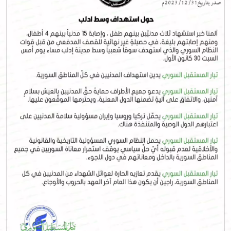 عقب استهداف وسط إدلب، تيار المستقبل السوري يدين الاعتداءات على المدنيين ويدعو لحمايتهم.