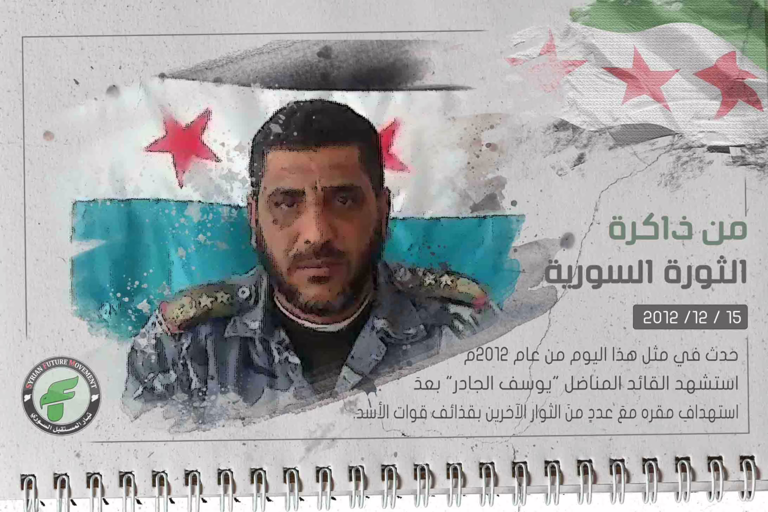 حدث في مثل هذا اليوم من عام 2012م، استشهد القائد المناضل "يوسف الجادر" بعدَ استهدافِ مقره معَ عددٍ منَ الثوار الآخرين بقذائف قوات الأسد.