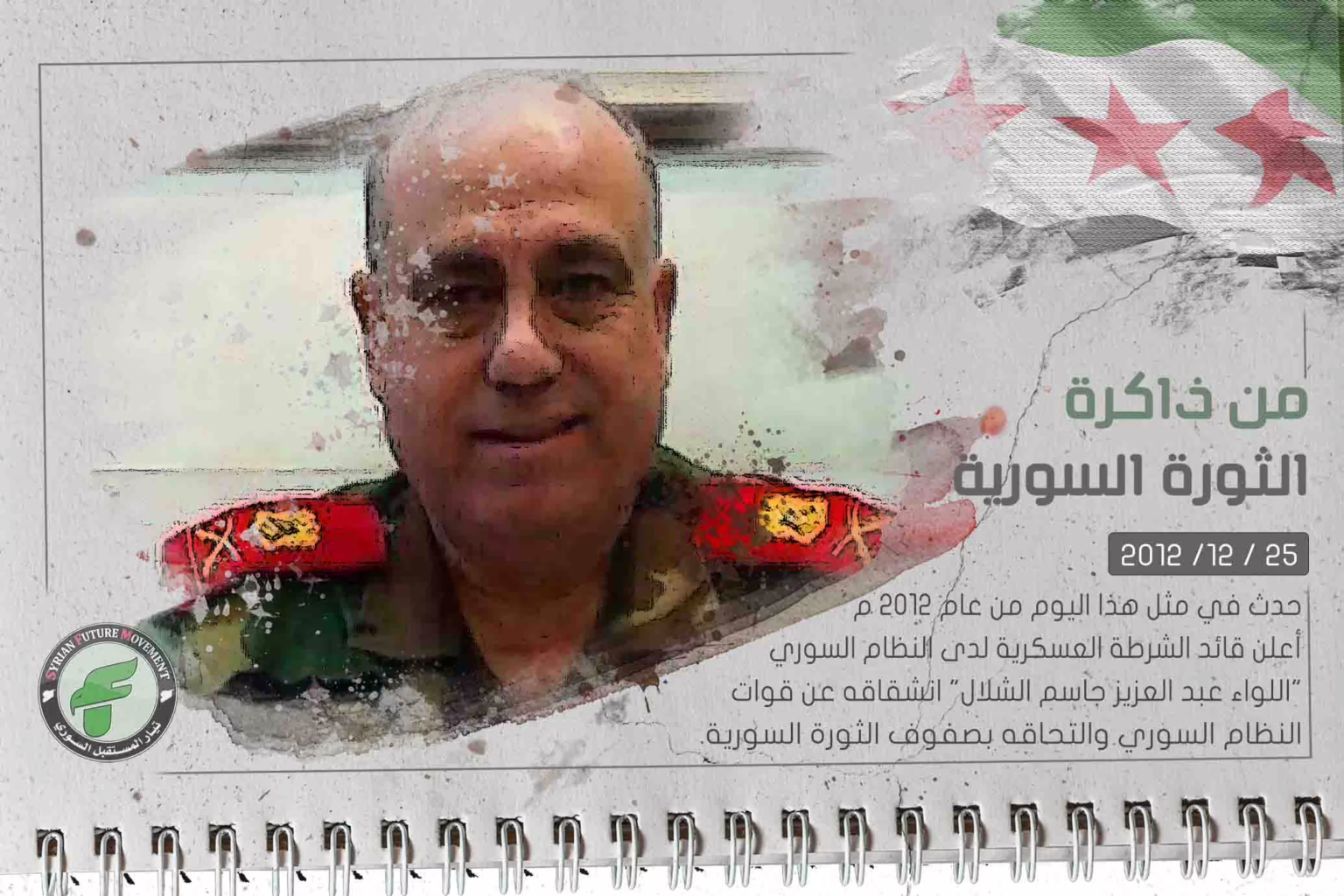 حدث في مثل هذا اليوم من عام 2012 م، أعلن قائد الشرطة العسكرية لدى النظام السوري"اللواء عبد العزيز جاسم الشلال" انشقاقه عن قوات النظام السوري والتحاقه بصفوف الثورة السورية.