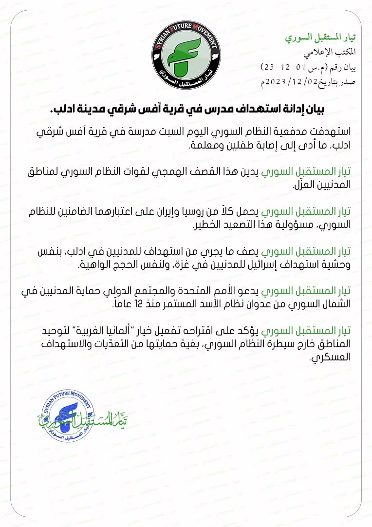 تيار المستقبل السوري يدعو الأمم المتحدة والمجتمع الدولي حماية المدنيين في الشمال السوري من عدوان نظام الأسد المستمر منذ ١٢ عاماً.