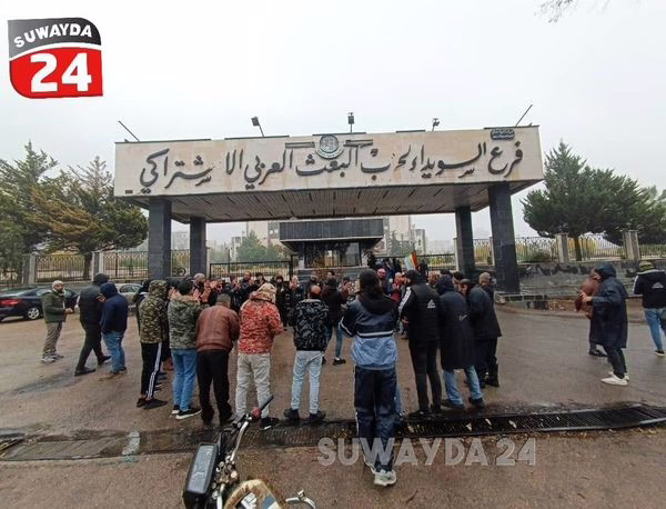 تجمع المحتجين أمام فرع حزب البعث في السويداء بعد أنباء عن عقد مؤتمر للشبيبة.