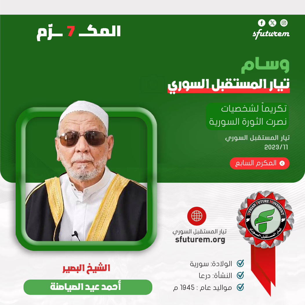 إننا في تيار المستقبل السوري نحيي رجال الدين الوطنيين المخلصين الذين لا يبيعون دينهم وكلمة الحق لديهم لأي بازار سياسي، كما ونحيي الشيخ الصياصنة أحد أبرز رموز الثورة السورية، والذي تمثل مواقفه الوطنية منهاجاً لرؤيتنا في تيار المستقبل السوري، وعلى ذلك نقلده وسام تيار المستقبل السوري عرفاناً ورمزاً وطنياً بامتياز.