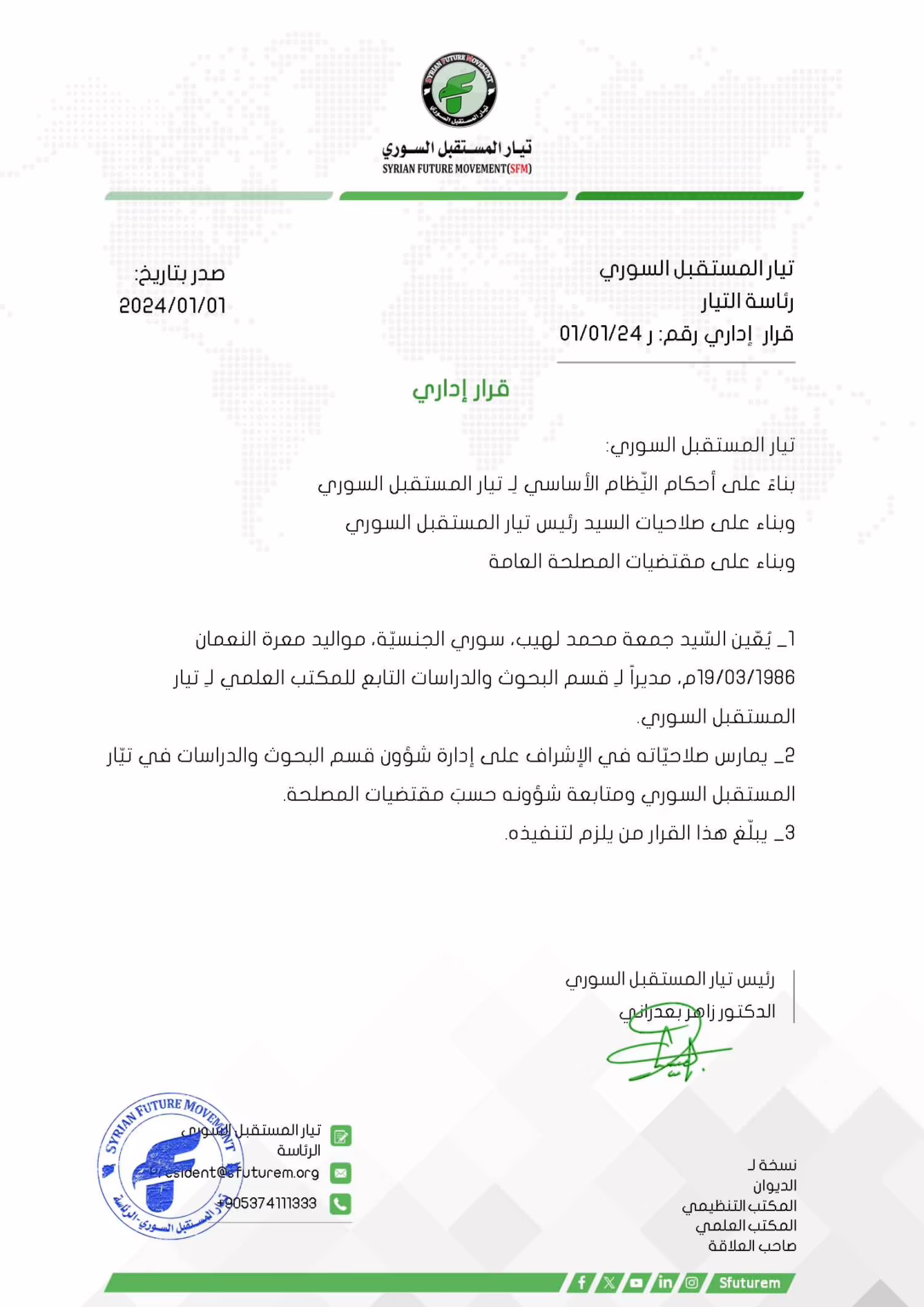 1_ يُعّين السّيد جمعة محمد لهيب، سوري الجنسيّة، مواليد معرة النعمان١٩٨٦/٠٣/١٩م، مديراً لـِ قسم البحوث والدراسات التابع للمكتب العلمي لـِ تيار المستقبل السوري.