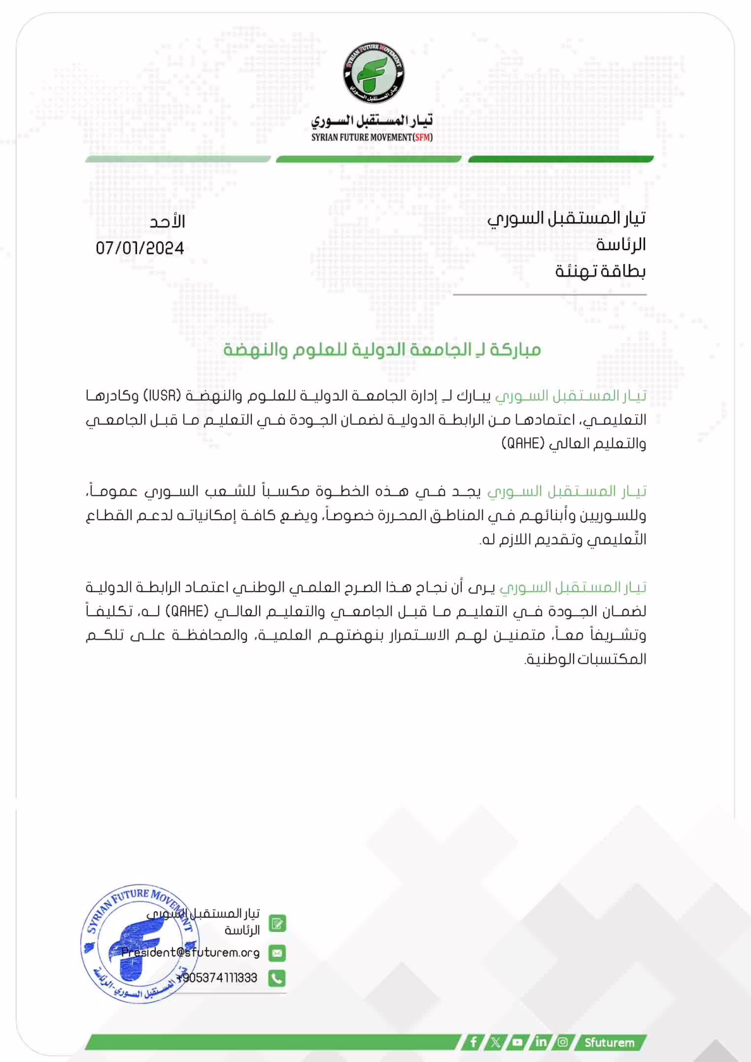 تيار المستقبل السوري يبارك لـِ إدارة الجامعة الدولية للعلوم والنهضة (IUSR) وكادرها التعليمي، اعتمادها من الرابطة الدولية لضمان الجودة في التعليم ما قبل الجامعي والتعليم العالي (QAHE)