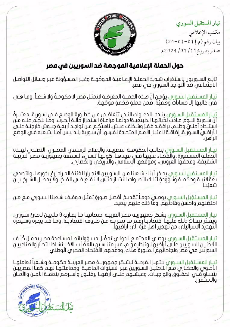 تيار المستقبل السوري يشكر جمهورية مصر العربية احتضانها ما يقارب 9 ملايين لاجئ سوري، ويقدِّر تبِعات ذلك عليها اقتصادياً رغم ما تمر به من ظروف اقتصادية، وما قد يجره وسيجره التهديد الإسرائيلي من تهجير أهل غزة إلى أراضيها.