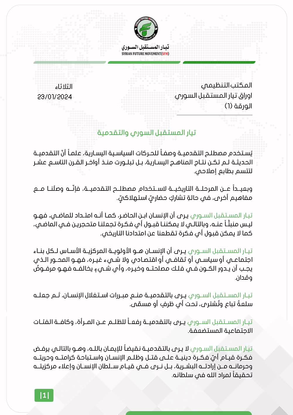 تيار المستقبل السوري لا يرى بالتقدمية انحلالاً وانعتاقاً من القيود الدينية والإجتماعية والثقافية أو موروثات الأمم الإيجابية، بل تأطيراً لها ودعماً لديموميتها ضمن إطارٍ منطقي يضمن حالة التوازنات حسب اختلاف أنماط المجتمعات.
