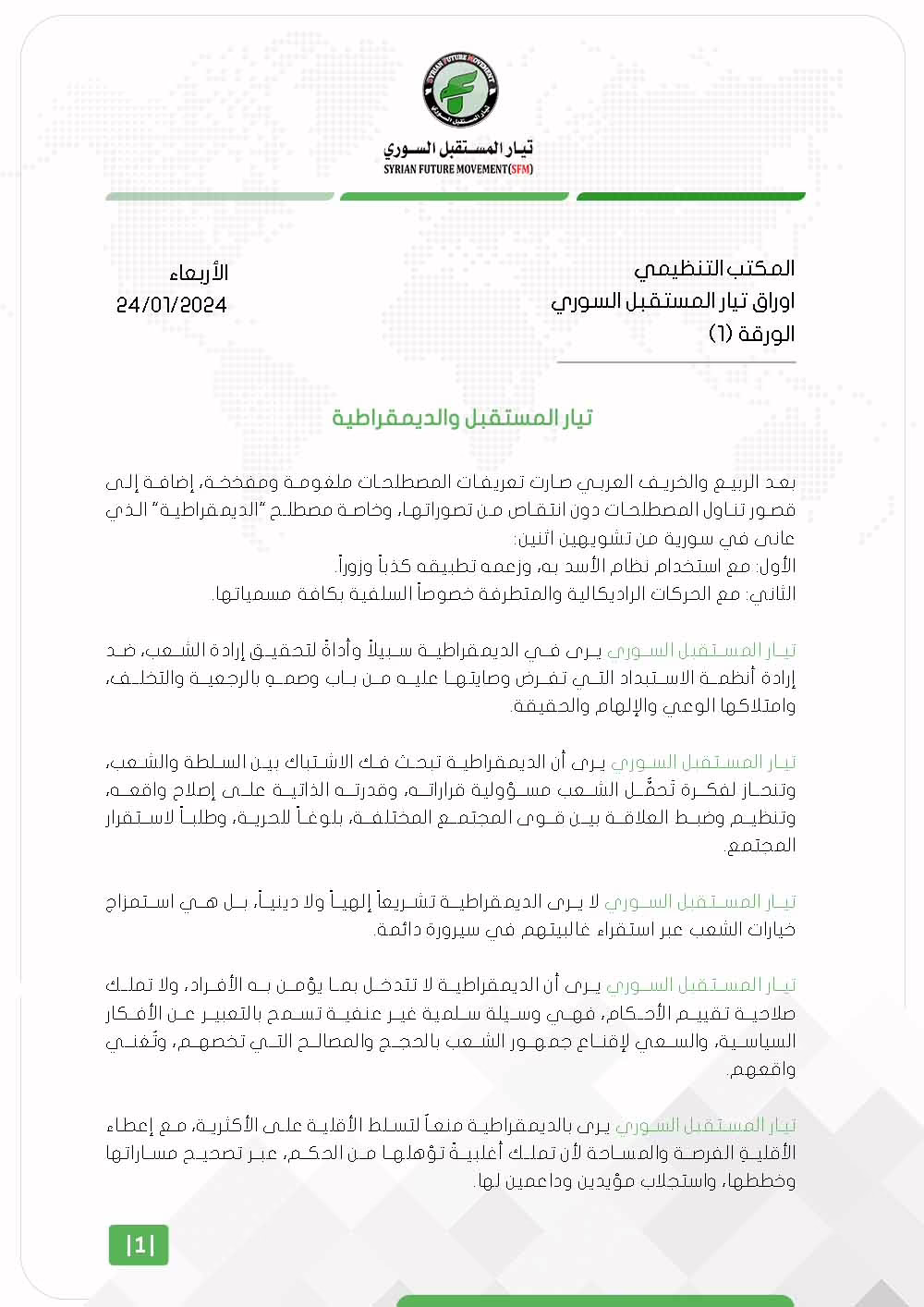 تيار المستقبل السوري لا يرى الديمقراطية تشريعاً إلهياً ولا دينياً، بل هي استمزاج خيارات الشعب عبر استقراء غالبيتهم في سيرورة دائمة.