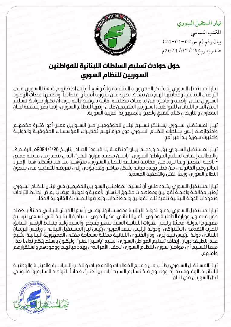 تيار المستقبل السوري إذ يشكر الجمهورية اللبنانية دولةً وشعباً على احتضانهم شعبنا السوري على الأراضي اللبنانية، وحمايتها لهم من تبعات الحرب في سورية أمنياً و اقتصادياً، وتحملها تبعات الوجود السوري على أراضيه و ماجره من تداعيات مختلفة، فإنه بالوقت ذاته يرى أن تكرار حوادث تسليم الأمن العام اللبناني للمواطنين السوريين المقيمين على أرضها للنظام السوري، إنما يضر بسمعة لبنان الحضاري والتاريخي كبلدٍ شقيقٍ ولصيق بالجمهورية العربية السورية.