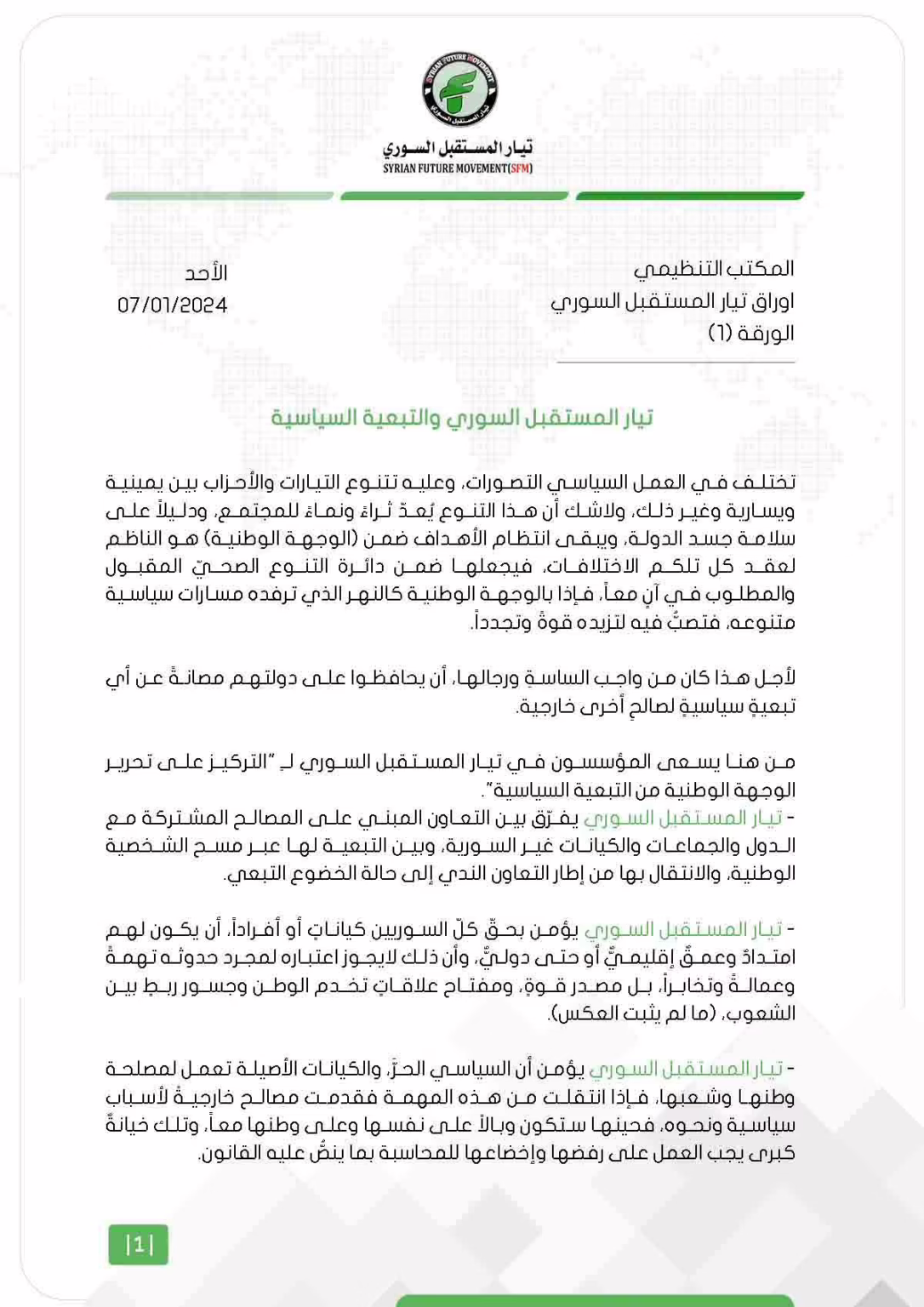 من هنا يسعى المؤسسون في تيار المستقبل السوري لـِ "التركيز على تحرير الوجهة الوطنية من التبعية السياسية".