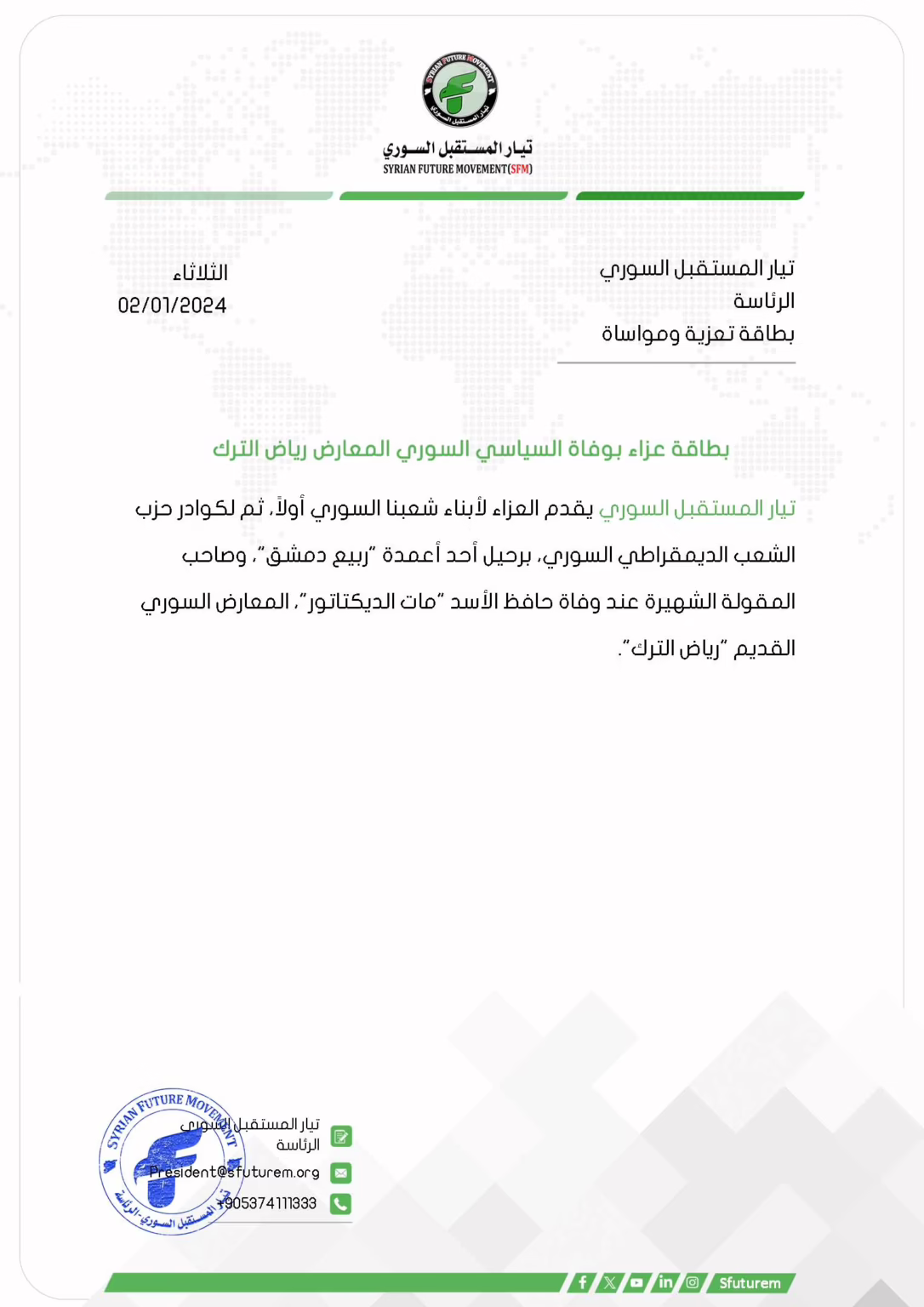 تيار المستقبل السوري يقدم العزاء لأبناء شعبنا السوري أولاً، ثم لكوادر حزب الشعب الديمقراطي السوري، برحيل أحد أعمدة "ربيع دمشق"، وصاحب المقولة الشهيرة عند وفاة حافظ الأسد "مات الديكتاتور"، المعارض السوري القديم "رياض الترك".