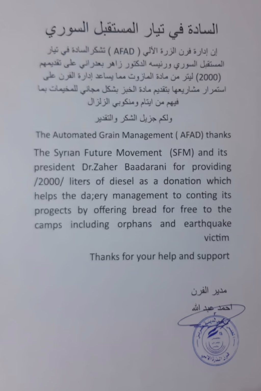 رسالة شكر من (AFAD) لتيار المستقبل السوري (SFM) على تقدمة الوقود لهم من أجل المساعدة في استمرار مشروعها بتقديم مادة الخبز بشكل مجاني للمخيمات بما فيهم من أيتام ومنكوبي الزلزال.