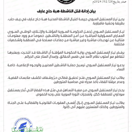 يدين تيار المستقبل السوري بكل قوة جريمة قتل الناشطة هبة حاج عارف ويطالب بتحقيق شفاف في القضية.