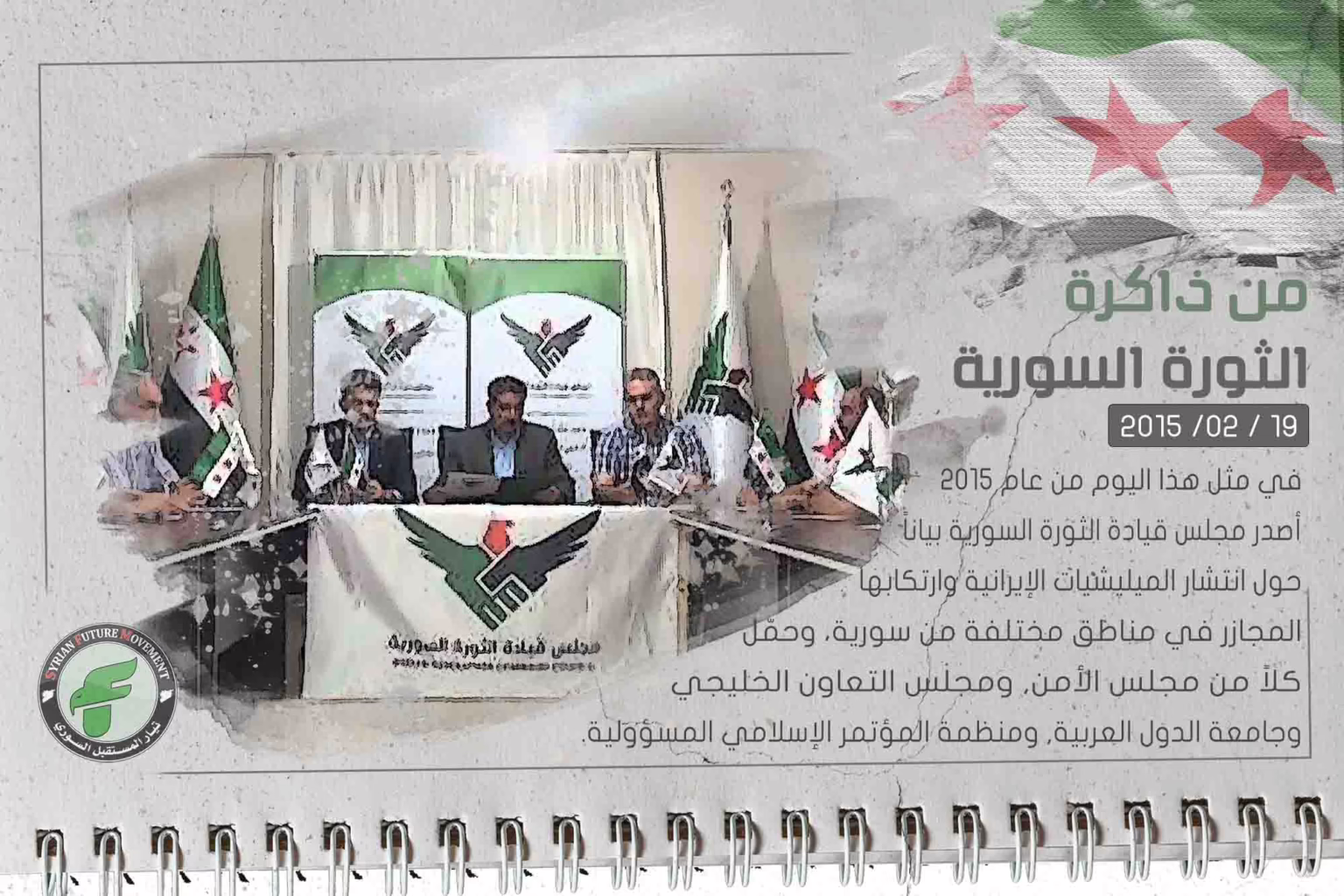في مثل هذا اليوم من عام 2015، أصدر مجلس قيادة الثورة السورية بياناً حول انتشار الميليشيات الإيرانية وارتكابها المجازر في مناطق مختلفة من سورية، وحمّل كلاً من مجلس الأمن, ومجلس التعاون الخليجي, وجامعة الدول العربية, ومنظمة المؤتمر الإسلامي المسؤولية.
