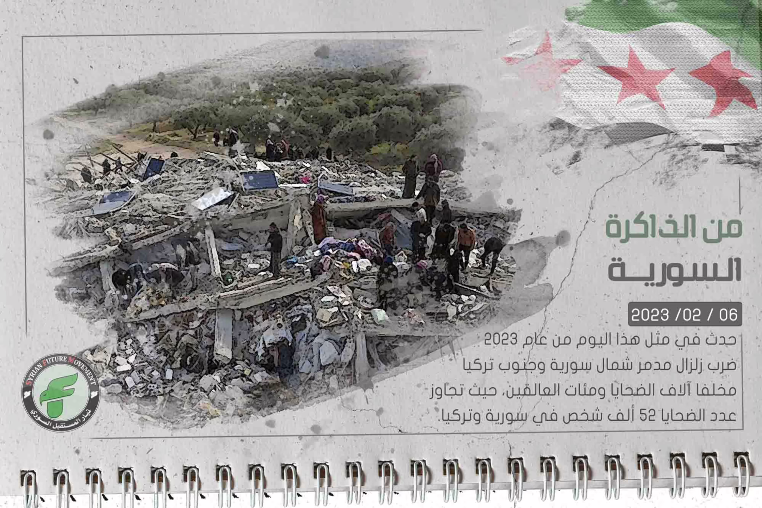 حدث في مثل هذا اليوم من عام 2023، ضرب زلزال مدمر شمال سورية وجنوب تركيا، مخلفا آلاف الضحايا ومئات العالقين، حيث تجاوز عدد الضحايا 52 ألف شخص في سورية وتركيا.