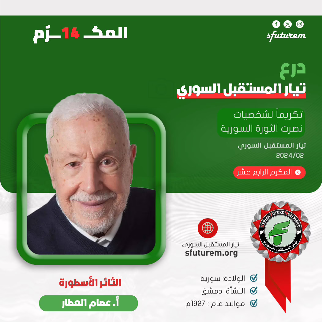 إننا في تيار المستقبل السوري، ولأجل تاريخه النضالي والسياسي، ووقوفه مع أبناء شعبه في ثورتهم ضد الظلم والطغيان، وعرفاناً منّا بالجميل لقامات سورية ورجالاتها العظماء، ولإسهاماته في تطور الفكر الإسلامي الحديث، ودوره في الدعوة إلى الديمقراطية وحقوق الإنسان، فإننا كما نتمنى له تمام الصحّة مع طول العمر حتى يرى سورية محرّرة موحدة، فإننا نقدّم درع تيار المستقبل السوري هذا الأسبوع لـِ الثائر الأسطورة: الأستاذ الأديب المربي عصام العطار، درعاً سوريّاً رمزيَّاً يحمل رؤيتنا ومنهجنا الوطنيَّ الجامع.