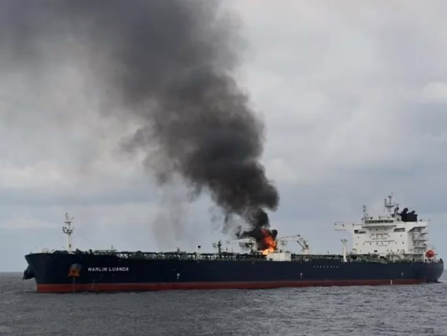 لندن تحذر من تسرب نفطي من أحد سفنها بعد إصابتها بهجوم للحوثيين.