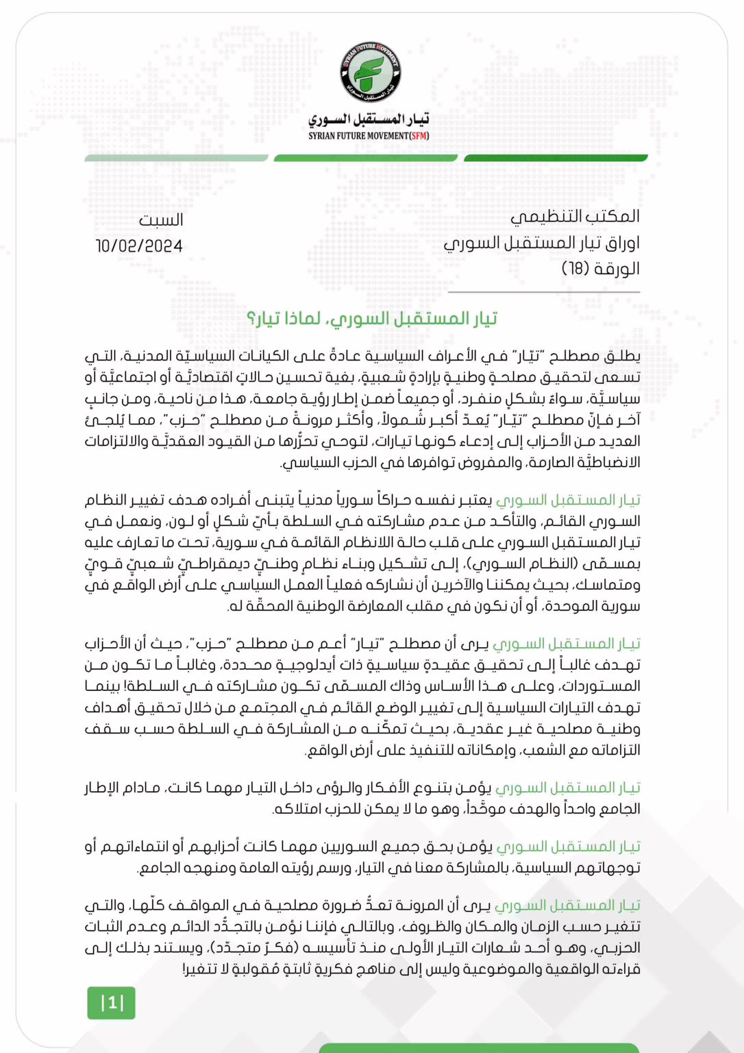 تيار المستقبل السوري يؤمن بالعمل المركزي المنظم، والتشاركية الفعالة في المسار الوطني، بكل الاتجاهات الاجتماعية والدينية والسياسية والفكرية.