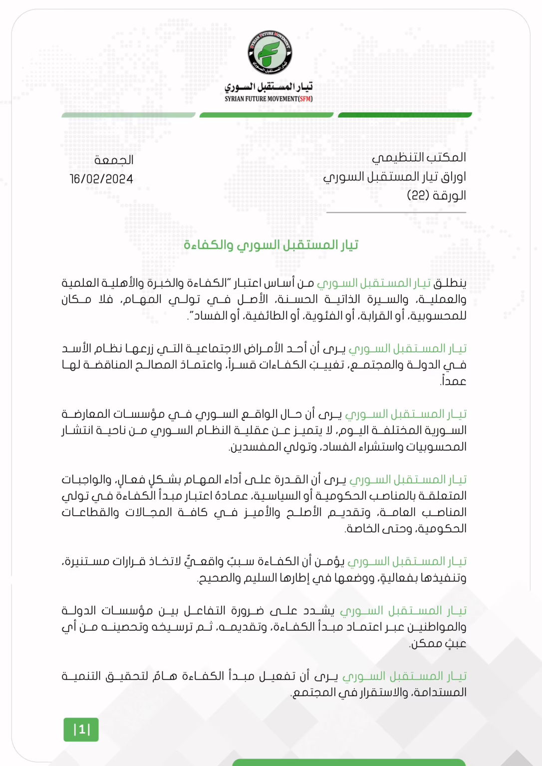 تيار المستقبل السوري يشدد على ضرورة التفاعل بين مؤسسات الدولة والمواطنين عبر اعتماد مبدأ الكفاءة، وتقديمه، ثم ترسيخه وتحصينه من أي عبثٍ ممكن.