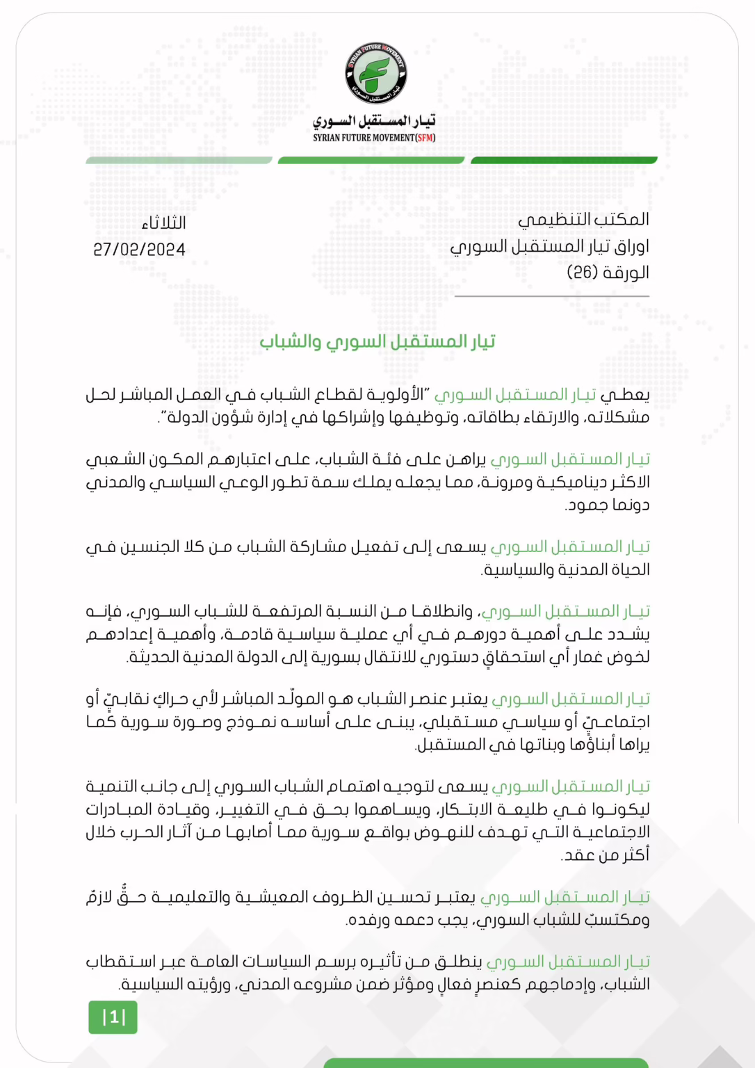 تيار المستقبل السوري يعمل على تعزيز التعاون بين الشباب والأحزاب السياسية والمنظمات المدنية، وإشراكهم في صنع القرار السوري.