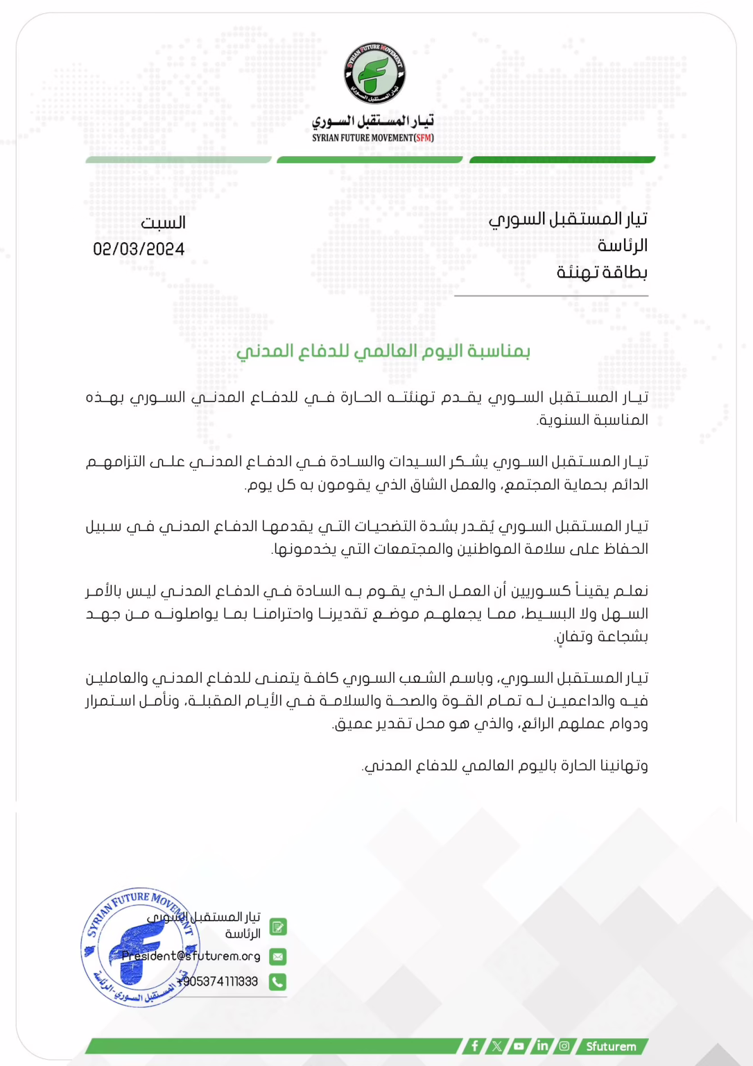 تيار المستقبل السوري، وباسم الشعب السوري كافة يتمنى للدفاع المدني والعاملين فيه والداعمين له تمام القوة والصحة والسلامة في الأيام المقبلة، ونأمل استمرار ودوام عملهم الرائع، والذي هو محل تقدير عميق.
