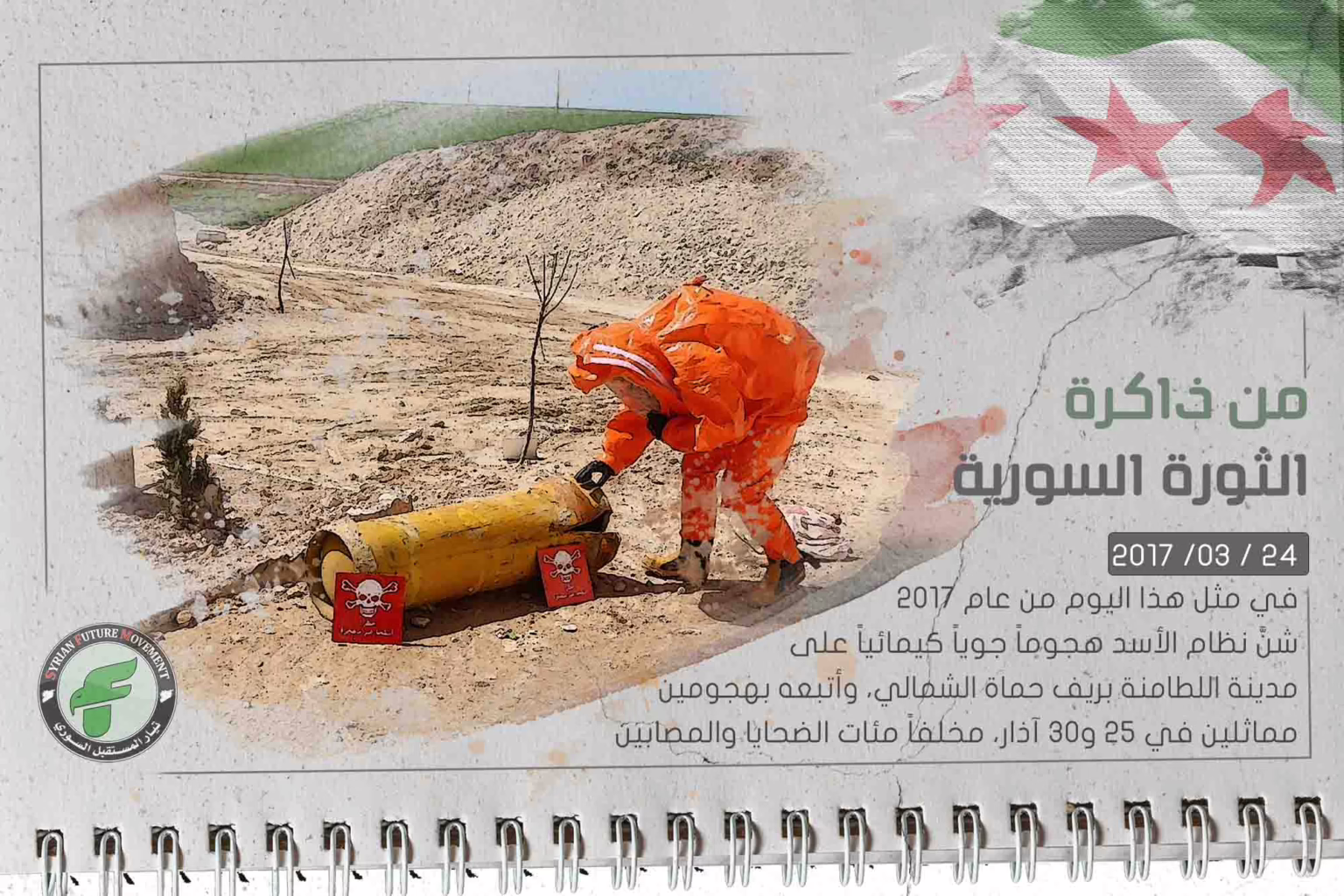 في مثل هذا اليوم من عام 2017 شنَّ نظام الأسد هجوماً جوياً كيمائياً على مدينة اللطامنة بريف حماة الشمالي، وأتبعه بهجومين مماثلين في 25 و30 آذار، مخلفاً مئات الضحايا والمصابين
