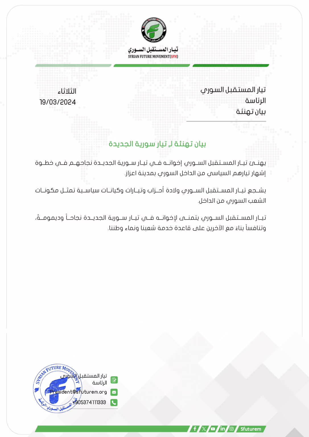 تيار المستقبل السوري يتمنى لإخوانه في تيار سورية الجديدة نجاحاً وديمومةً، وتنافساً بناءً مع الآخرين على قاعدة خدمة شعبنا ونماء وطننا.