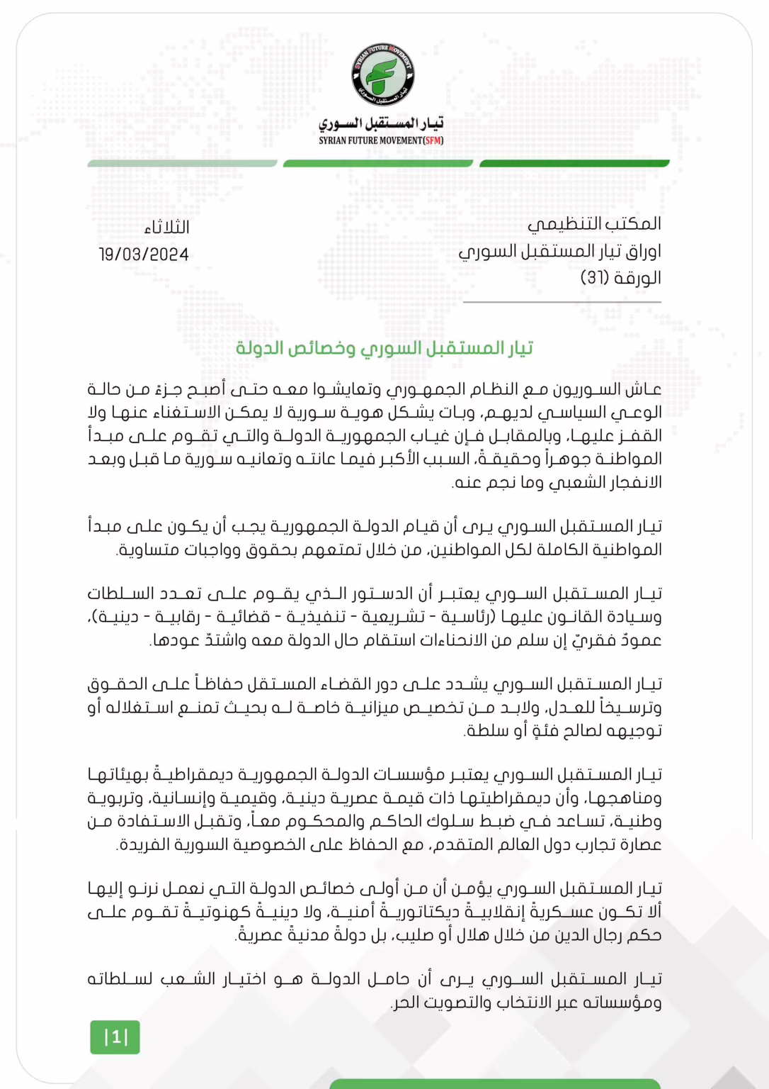تيار المستقبل السوري يرى أن حامل الدولة هو اختيار الشعب لسلطاته ومؤسساته عبر الانتخاب والتصويت الحر.