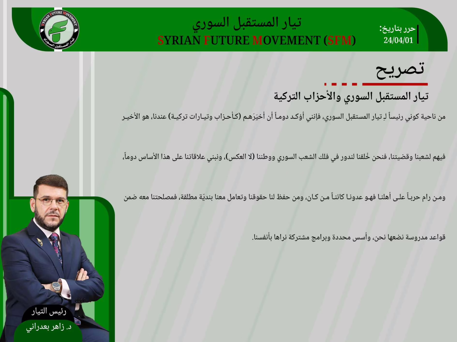 من ناحية كوني رئيساً لـِ تيار المستقبل السوري، فإنني أؤكد دوماً أن أخيَرَهم (كأحزاب وتيارات تركية) عندنا، هو الأخير فيهم لشعبنا وقضيتنا، فنحن خُلقنا لندور في فلك الشعب السوري ووطننا (لا العكس)، ونبني علاقاتنا على هذا الأساس دوماً، ومن رام حرباً على أهلنا فهو عدونا كائناً من كان، ومن حفظ لنا حقوقنا وتعامل معنا بنديّة مطلقة، فمصلحتنا معه ضمن قواعد مدروسة نضعها نحن، وأسس محددة وبرامج مشتركة نراها بأنفسنا.