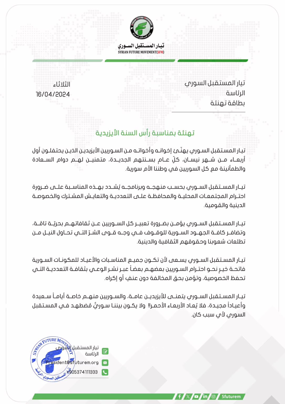 تيار المستقبل السوري يهنّئ إخوانه وأخواته من السوريين الأيزيدين الذين يحتفلون أول أربعاء من شهر نيسان، كلِّ عامٍ بسنتهم الجديدة، متمنين لهم دوام السعادة والطمأنينة مع كل السوريين في وطننا الأم سورية.
